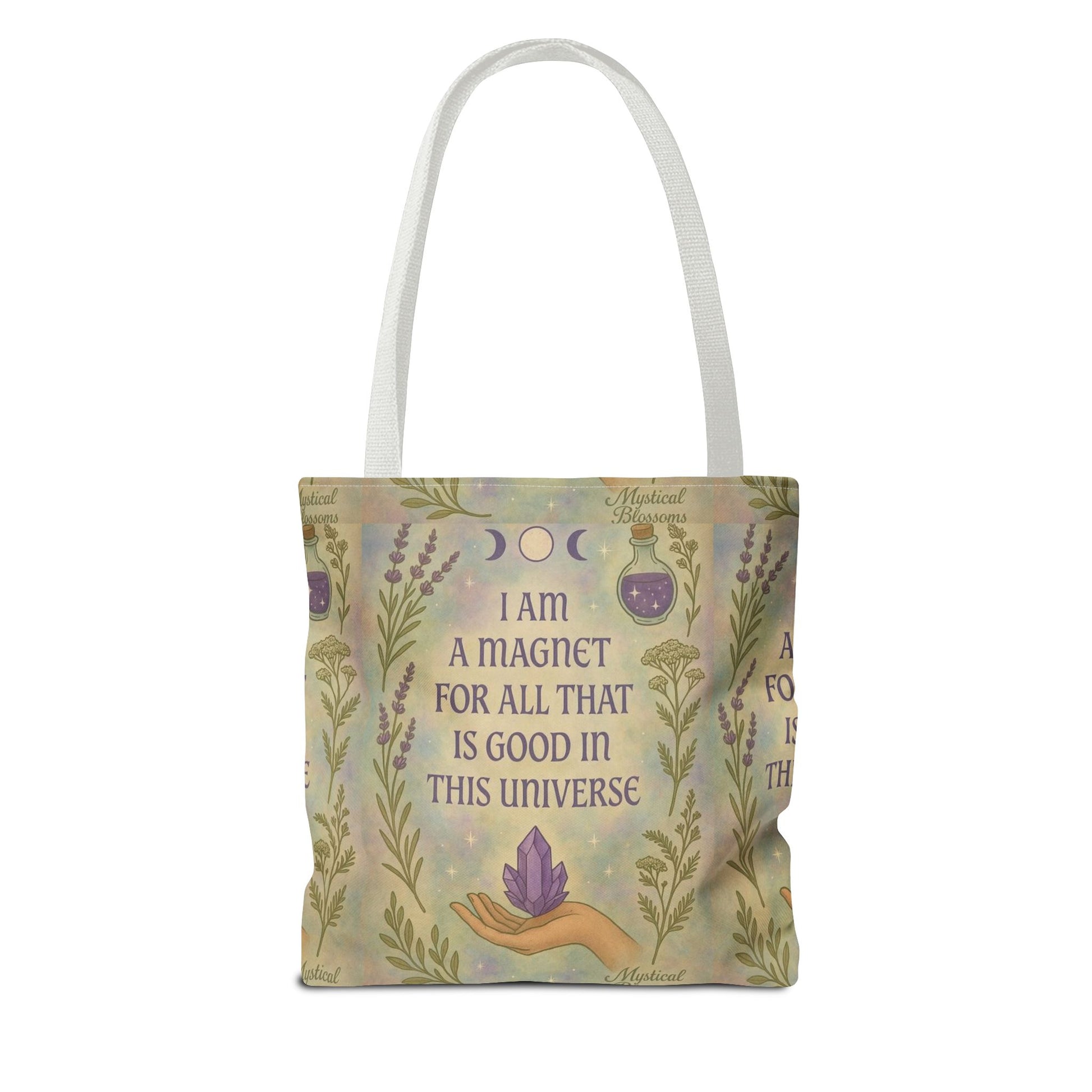 Discover the perfect blend of style and functionality with this beautifully designed tote bag. Featuring an enchanting illustration that inspires positivity and affirmations, this bag is ideal for those who appreciate both art and practicality. The vibrant design, decorated with celestial motifs, adds a touch of whimsy to everyday outings. Whether you’re heading to the farmers' market, a beach day, or just running errands, this tote bag will elevate your look while being an essential accessory. Perfect for enthusiasts of spirituality, wellness, or anyone who enjoys a bit of magic in their daily life, this tote is a thoughtful gift for birthdays, holidays, or just because. Embrace a chic vibe that resonates with good energy and makes every day feel special!